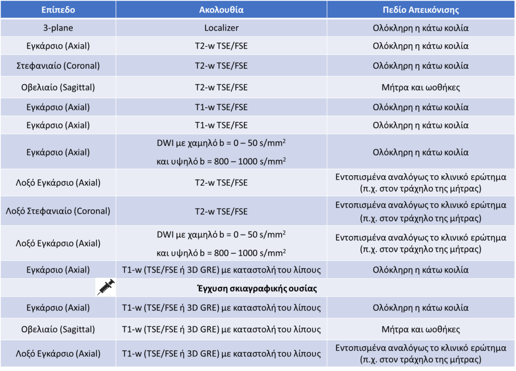 · Ένα τυπικό πρωτόκολλο ρουτίνας MRI κάτω κοιλίας για την διερεύνηση των γυναικολογικών οργάνων παρουσιάζεται στον παρακάτω πίνακα.