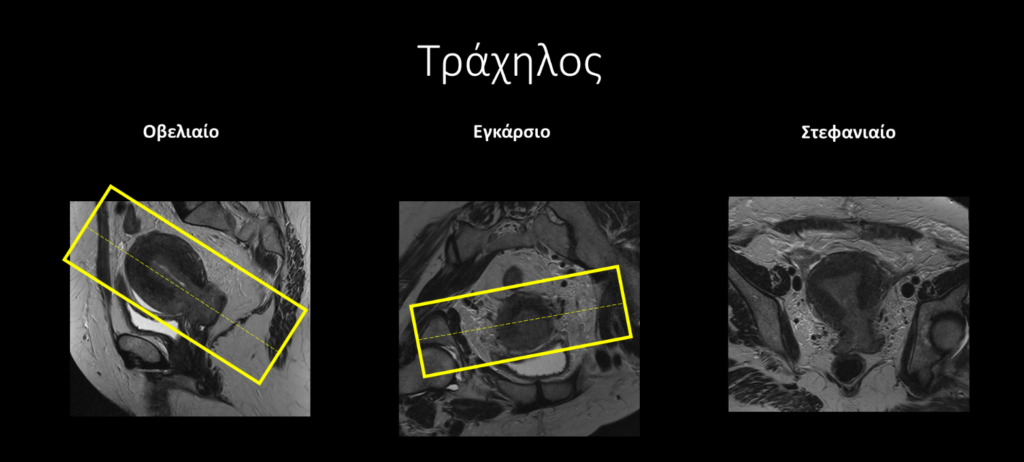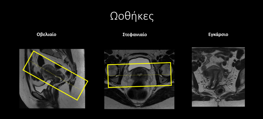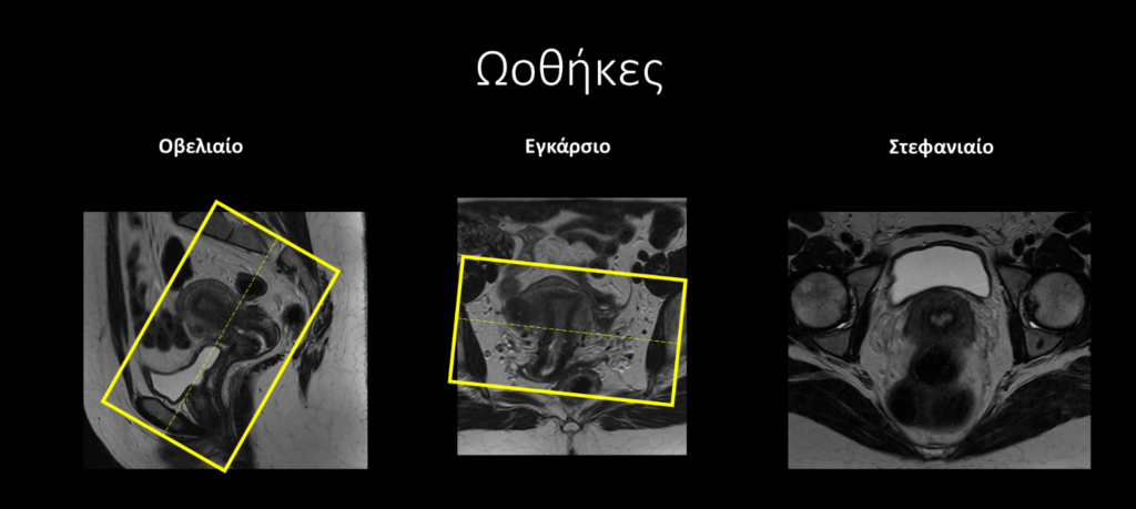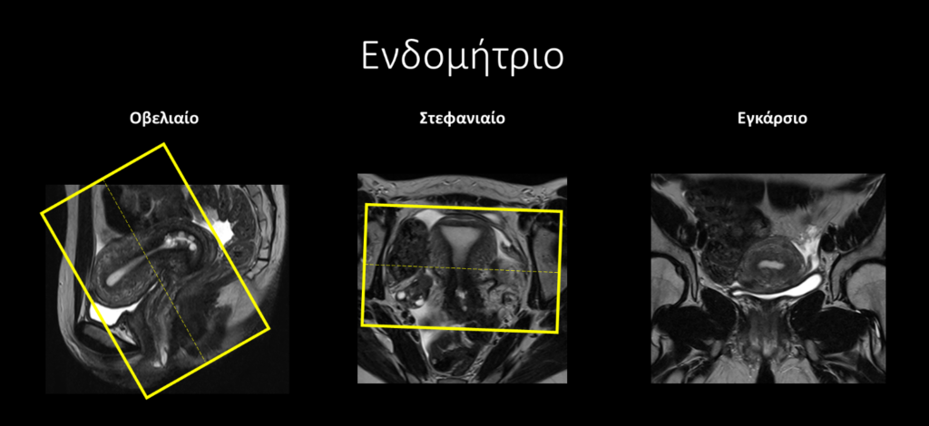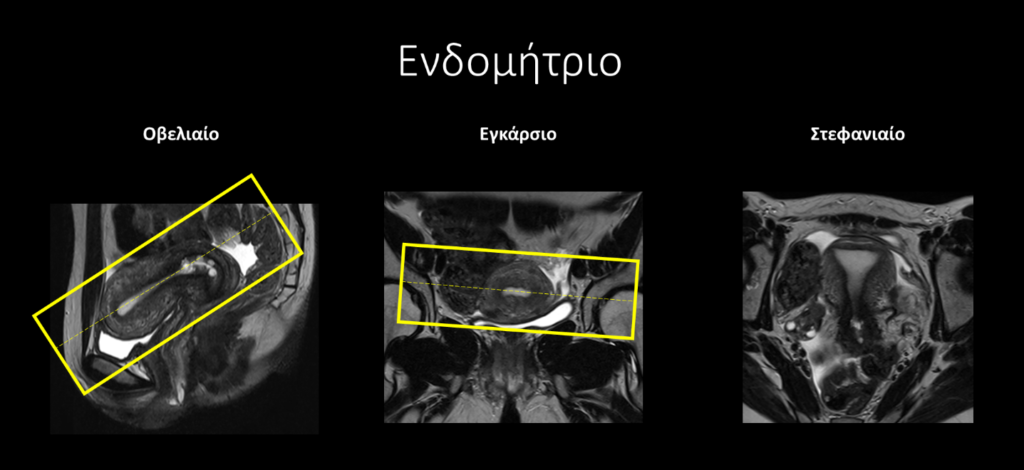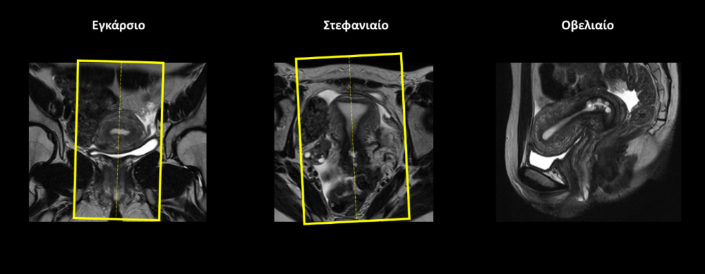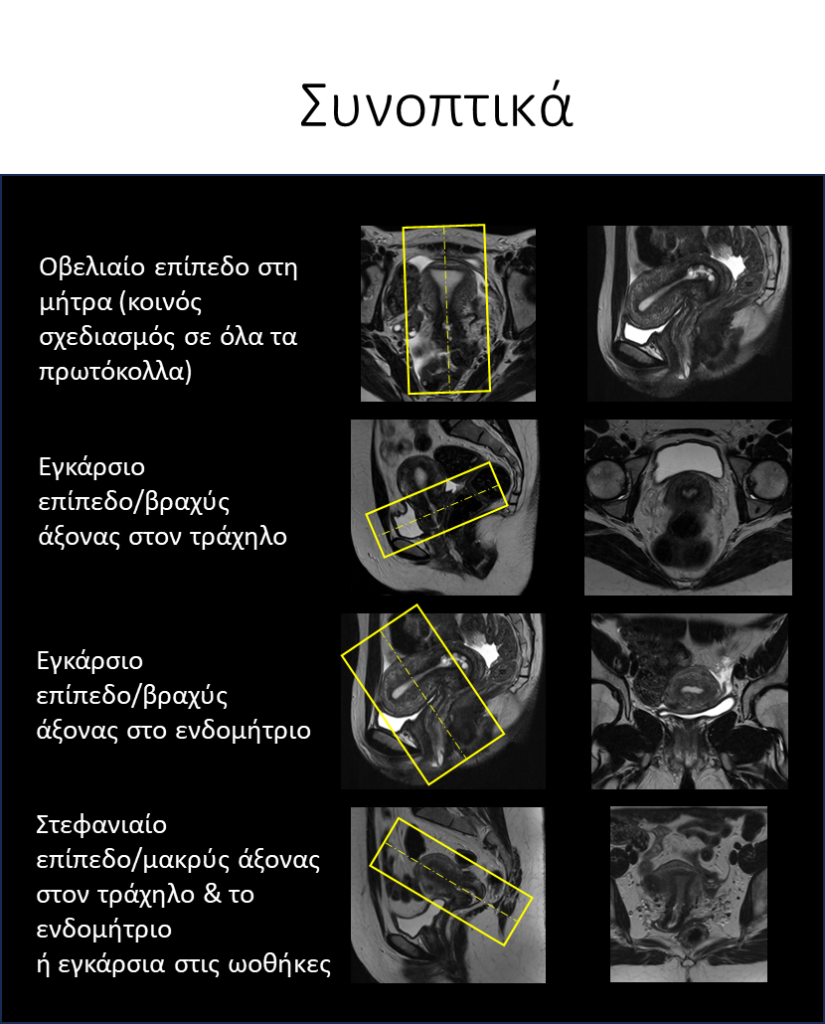 · Υψηλής ευκρίνειας Τ2-w ακολουθίες με μικρό FOV και πάχος τομής που καλύπτουν την μήτρα και τις ωοθήκες. Ανάλογα την περιοχή ενδιαφέροντος πρέπει να δίνεται και η κατάλληλη κλίση (βλ. σχεδιασμό παρακάτω). Π.χ. για την αξιολόγηση του ενδομητρίου, δίνεται κλίση κάθετη (oblique εγκάρσια) με τον επιμήκη άξονα του ενδομητρίου και παράλληλη (oblique στεφανιαία) με τον επιμήκη άξονα του ενδομητρίου.
