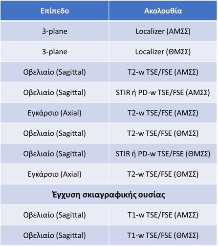 • Το πρωτόκολλο απεικόνισης μπορεί να διαφέρει ανάλογα με το κλινικό ερώτημα και την προτίμηση του κάθε τμήματος Μαγνητικής Τομογραφίας.