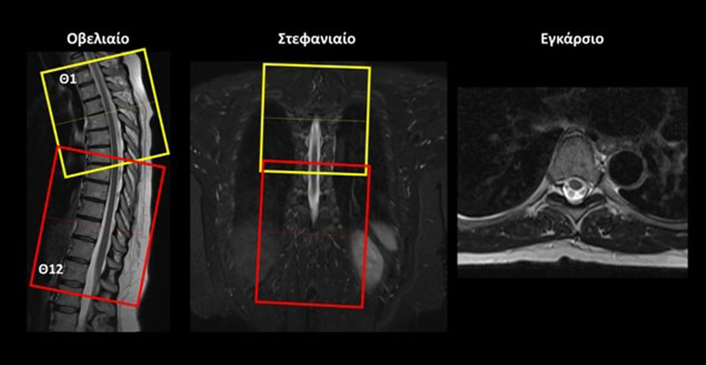 Εγκάρσιο (Axial/Transversal) στην ΘΜΣΣ: λαμβάνονται 2 επικαλυπτόμενα πακέτα, και οι εγκάρσιες τομές σχεδιάζονται κάθετα στον νωτιαίο μυελό, τόσο στο οβελιαίο όσο και στο στεφανιαίο επίπεδο. ΠΡΟΣΟΧΗ! Τα δυο πακέτα πρέπει να ληφθούν ως δύο διαφορετικές ακολουθίες ώστε να μην δημιουργηθεί τεχνικό σφάλμα διασταυρούμενης διέγερσης (cross-talk) στο επίπεδο που τέμνονται οι τομές. Οι τομές πρέπει να περιλαμβάνουν από το επίπεδο Α7-Θ1 έως και το επίπεδο Ο1-Ο2, με σκοπό η κάλυψη να περιλαμβάνει έως και τον μυελικό κώνο.