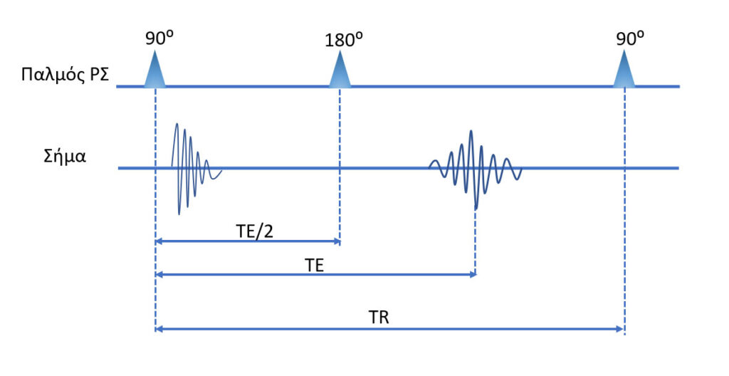Η ακολουθία Spin Echo (SE) αποτελεί θεμελιώδη ακολουθία για την απεικόνιση με μαγνητικό συντονισμό. Αρχικά εφαρμόζεται ένας παλμός διέγερσης 90⁰ ο οποίος στρέφει τη διαμήκη μαγνήτιση στο εγκάρσιο επίπεδο. Αμέσως μετά το τέλος του παλμού διέγερσης έχουμε την εμφάνιση του σήματος FID (Free Induction Decay). Για την ανάκτηση του σήματος FID εφαρμόζεται μετά από χρόνο που ισούται με TE/2 (Time to Echo/2) παλμός επανεστίασης 180⁰. Μετά από χρόνο TE έχουμε τη συλλογή του σήματος Spin Echo. Ο χρόνος που μεσολαβεί μεταξύ δύο παλμών διεγέρσεων ονομάζεται Repetition Time (TR).