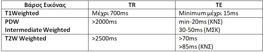 Τυπικές τιμές παραμέτρων ακολουθίας SE για απεικονιστικά συστήματα 1,5Τ